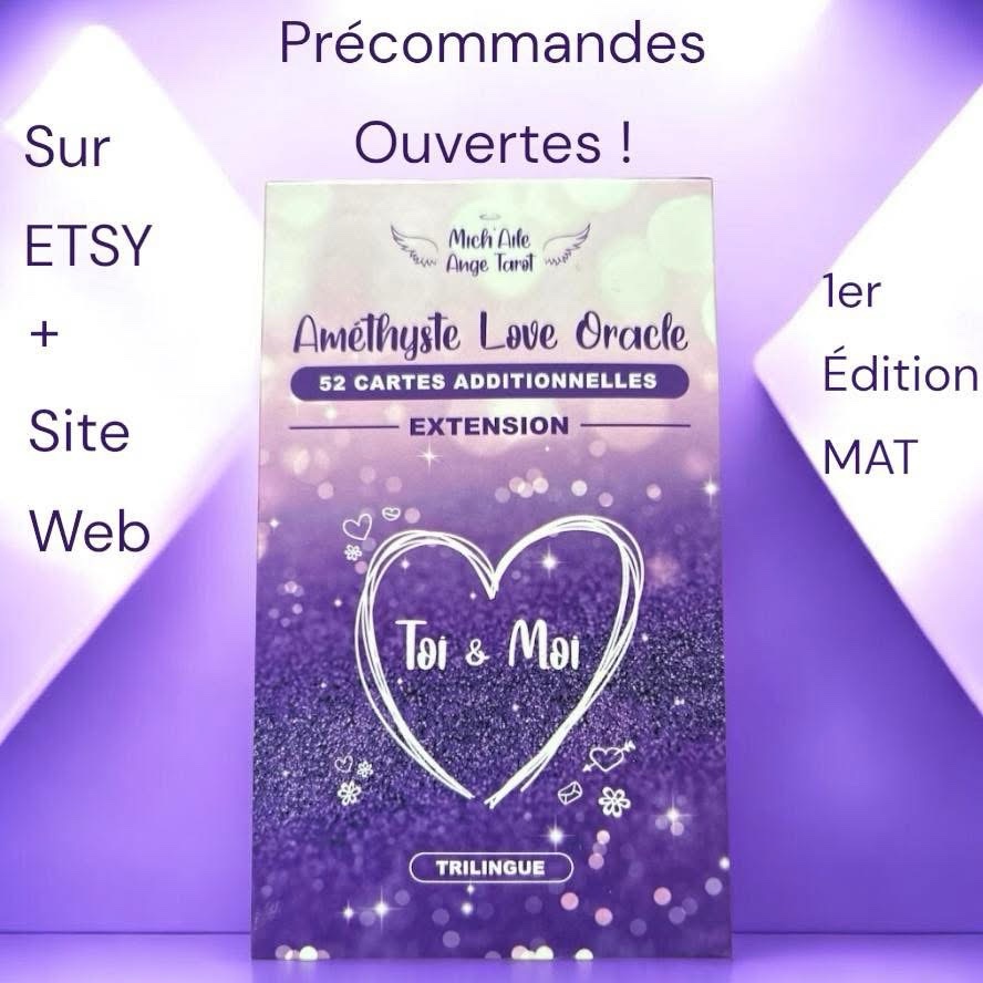 Lot de 4 extensions 52 cartes pour l’Améthyste Love Oracle trilingue + boîte standard + notice.